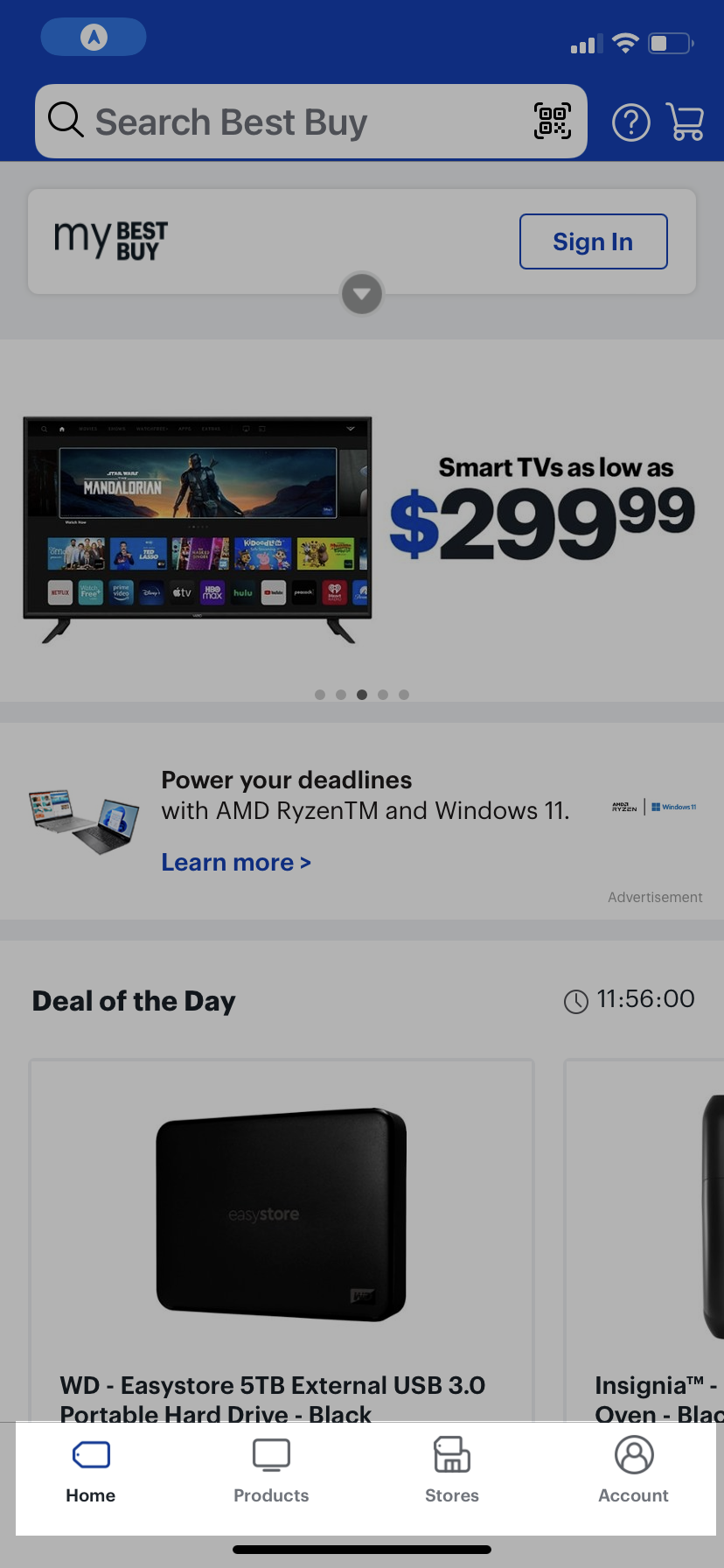 These 4 tabs (Home, Products, Stores & Account) represent the main menu for the Best Buy retail app.